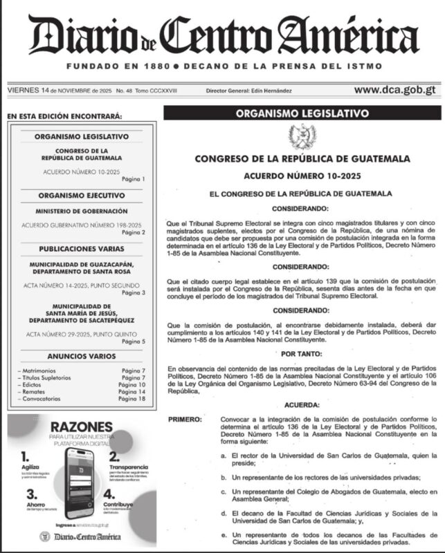 A través del Acuerdo 10-2025, el Congreso de la República oficializó la convocatoria para la integración de la comisión de postulación para la elección de magistrados al Tribunal Supremo Electoral (TSE), tomando en cuenta que la actual magistratura finaliza su período el 19 de marzo de 2026.