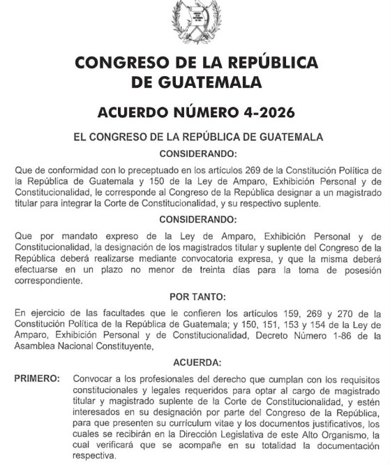De esa cuenta convoca, por medio de la publicación del Acuerdo Legislativo 4-2026 en el Diario Oficial, a los profesionales del derecho interesados en ser designados por el Congreso, a presentar sus expedientes, en base a los requisitos que establece la ley.