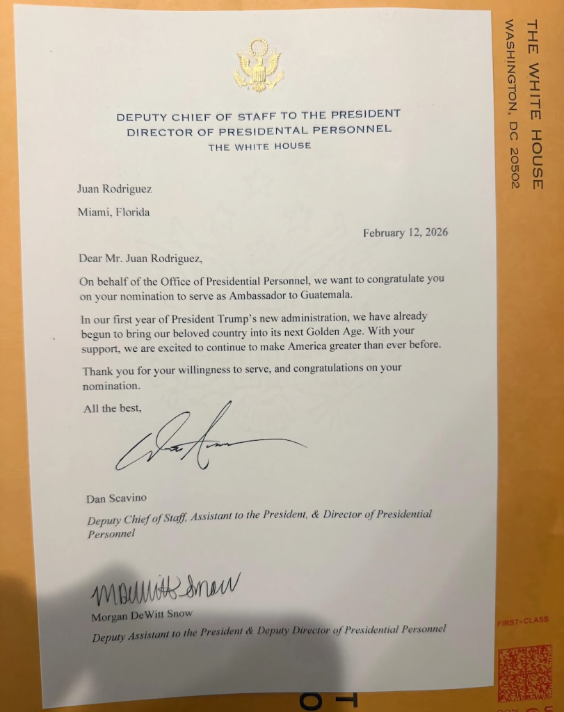 Luego de la nominación de Juan Rodríguez como Embajador Extraordinario y Plenipotenciario de los Estados Unidos en Guatemala, a la espera de ser aprobada por el Senado estadounidense, se conoce que es un profesional del derecho, originario de Florida, con amplia experiencia en la resolución y gestión de conflictos multinacionales.