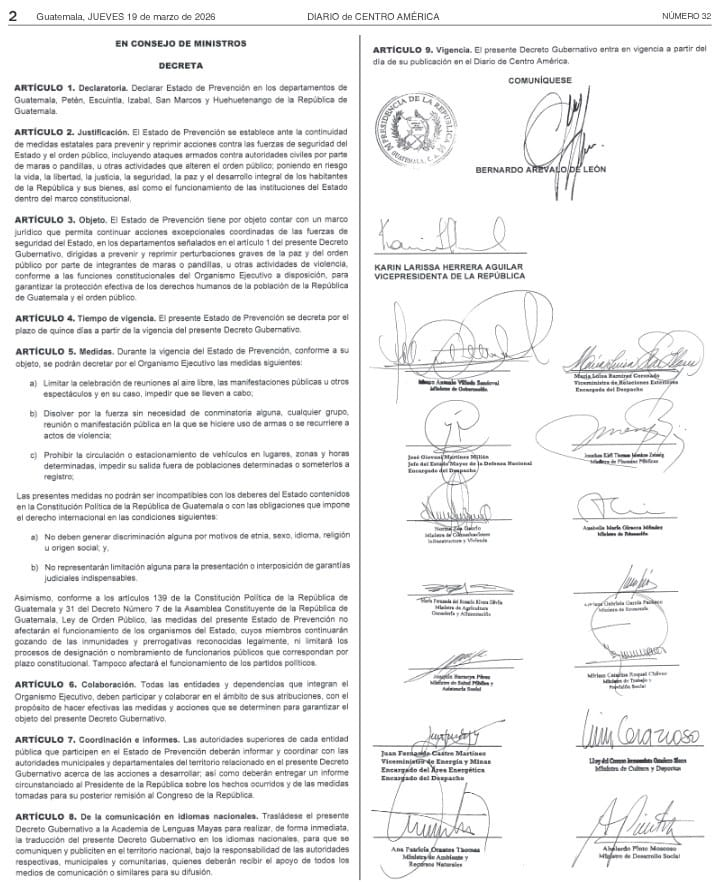 Mediante el Decreto Gubernativo 4-2026, el Organismo Ejecutivo declaró un nuevo Estado de Prevención, el cual se aplicará sólo en seis departamentos del país, siendo estos Guatemala, Petén, Escuintla, Izabal, San Marcos y Huehuetenango.