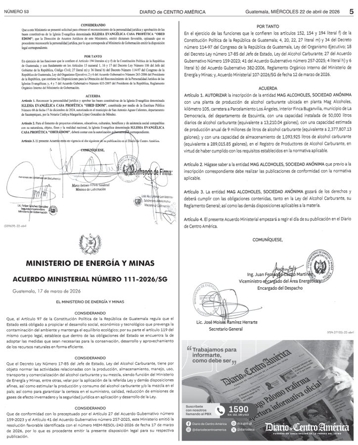Por medio del Acuerdo Ministerial Número 111-2026/SG, el MEM autorizó la inscripción de la entidad MAG Alcoholes, Sociedad Anónima en el Registro de Productores de Alcohol Carburante, publicado en el diario oficial.